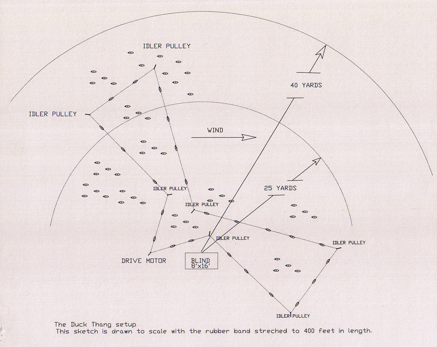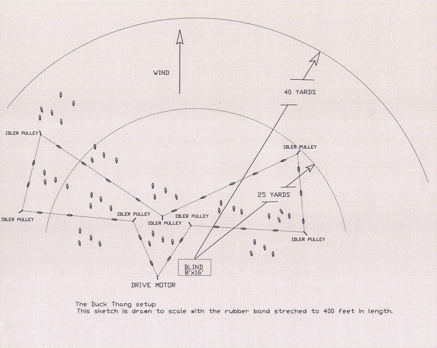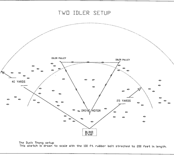 There are many ways you can set up the Duck Thang Motion Decoy System. On this page, we have four diagrams of how it can be used. You can set it up using the basic kit, or purchase additional idler pulleys and follow the diagrams to work the decoy spread with those. We have several diagrams on this page for you to use, and instructional videos also.
